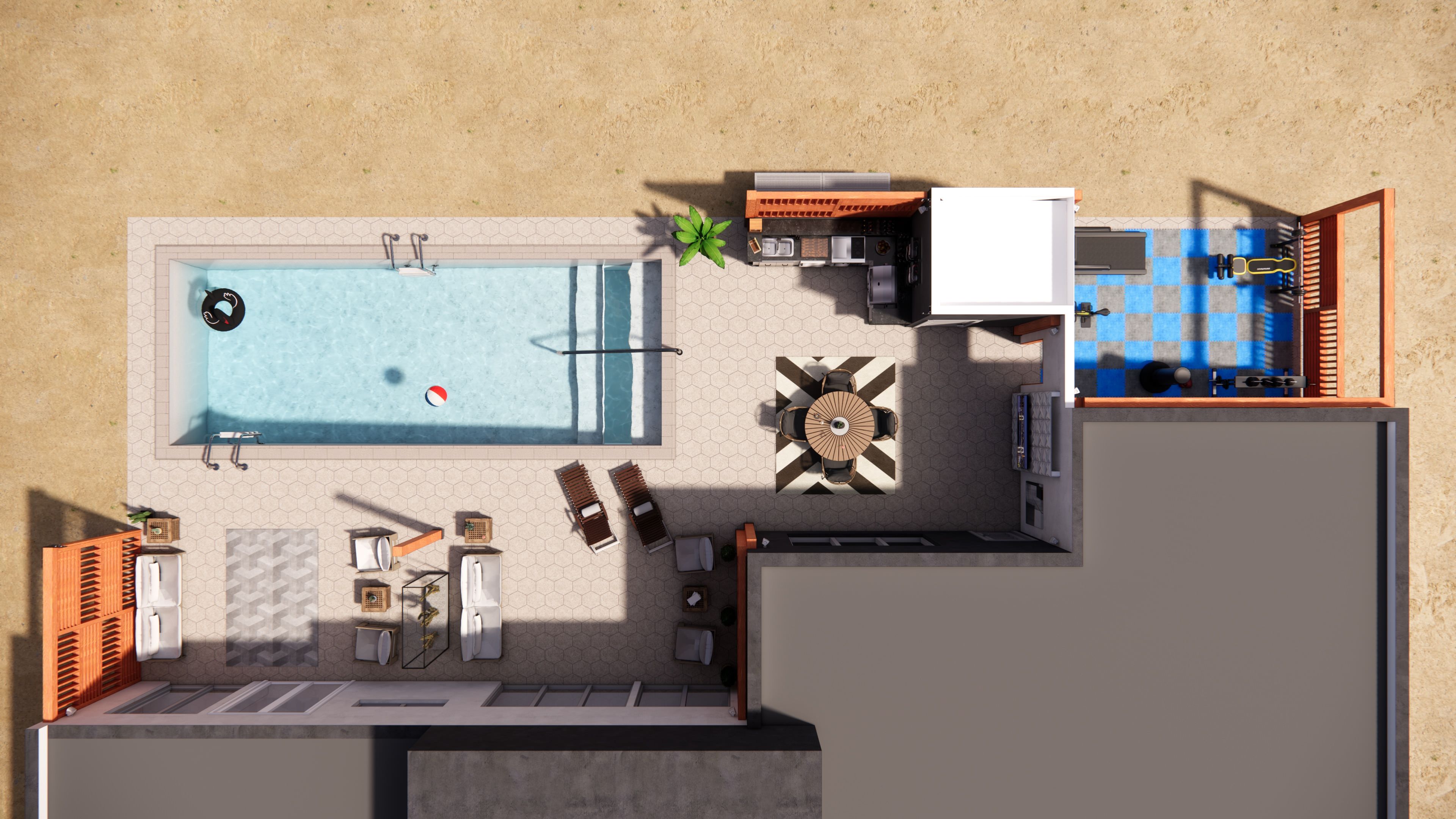 The client’s primary goal was to make the pool the focal point of the space, while also incorporating areas for gathering and relaxation, an outdoor kitchen, and an exterior home gym. DAE Group developed a thoughtful design that met all of the client’s needs within a compact footprint—creating clear separation between functional areas while maintaining a cohesive and inviting outdoor environment.